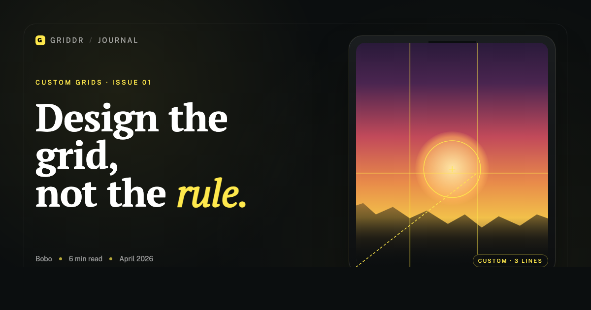 A custom grid is a composition template you draw yourself and keep. You decide where the lines go, how many of them, and what shape they form. In Griddr, the editor lets you sketch vertical and horizontal lines at arbitrary positions, add diagonals, and drop circles or ovals to mark focus regions.